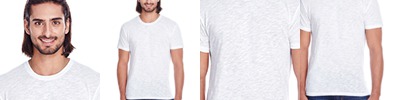 4.1 oz., 50% polyester, 38% combed ringspun cotton, 12% rayon; 7.8 oz./lin yd., 50% polyester, 38% combed ringspun cotton, 12% rayon; Frosted vintage heather triblend yarn; Smooth surface ideal for screen printing; 32 singles; Retail fit; Side-seamed; Tear away label;