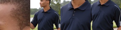 100% polyester wicking mesh * Wicks moisture away from the body * Heat sealed label * Tipped rib-knit lap-over collar